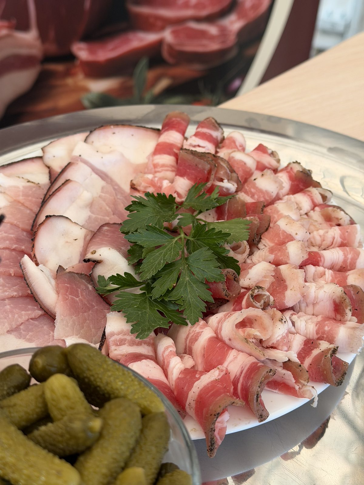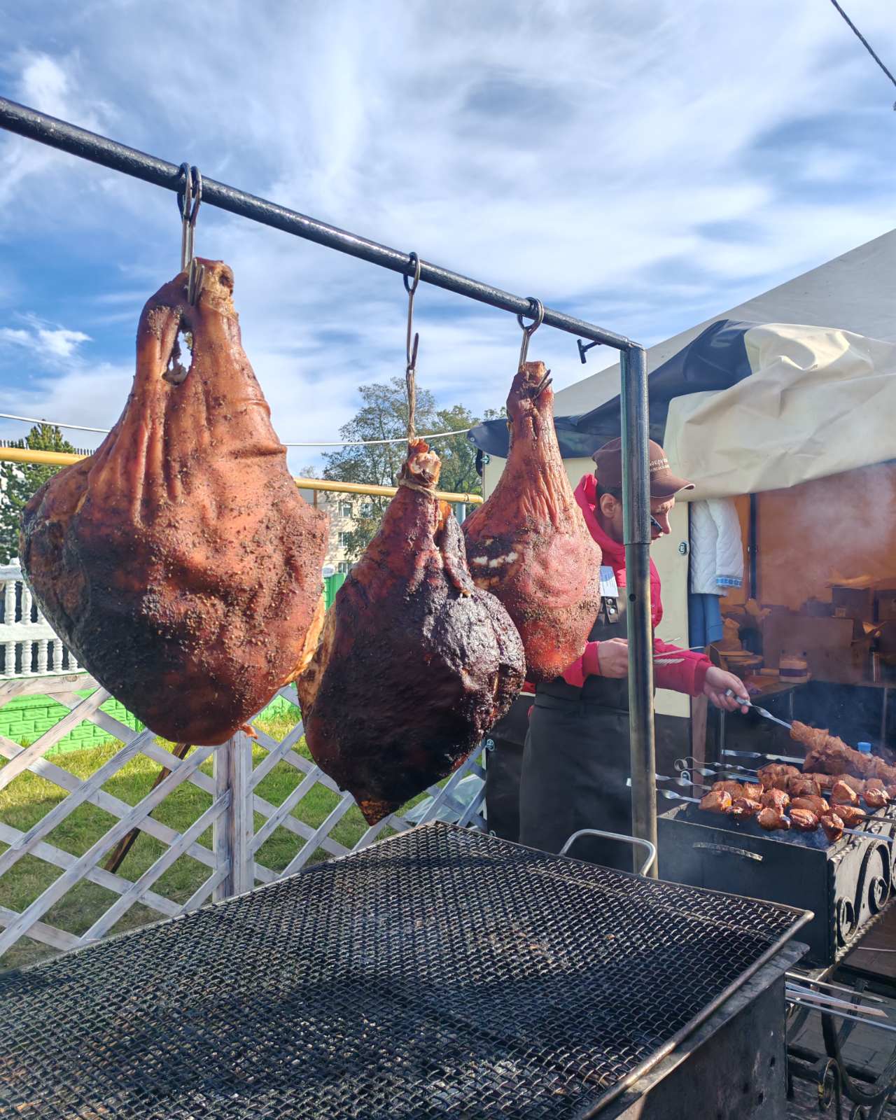 Гости праздника высоко оценили фирменные угощения: аппетитный окорок, сочный шашлык и колбаски.