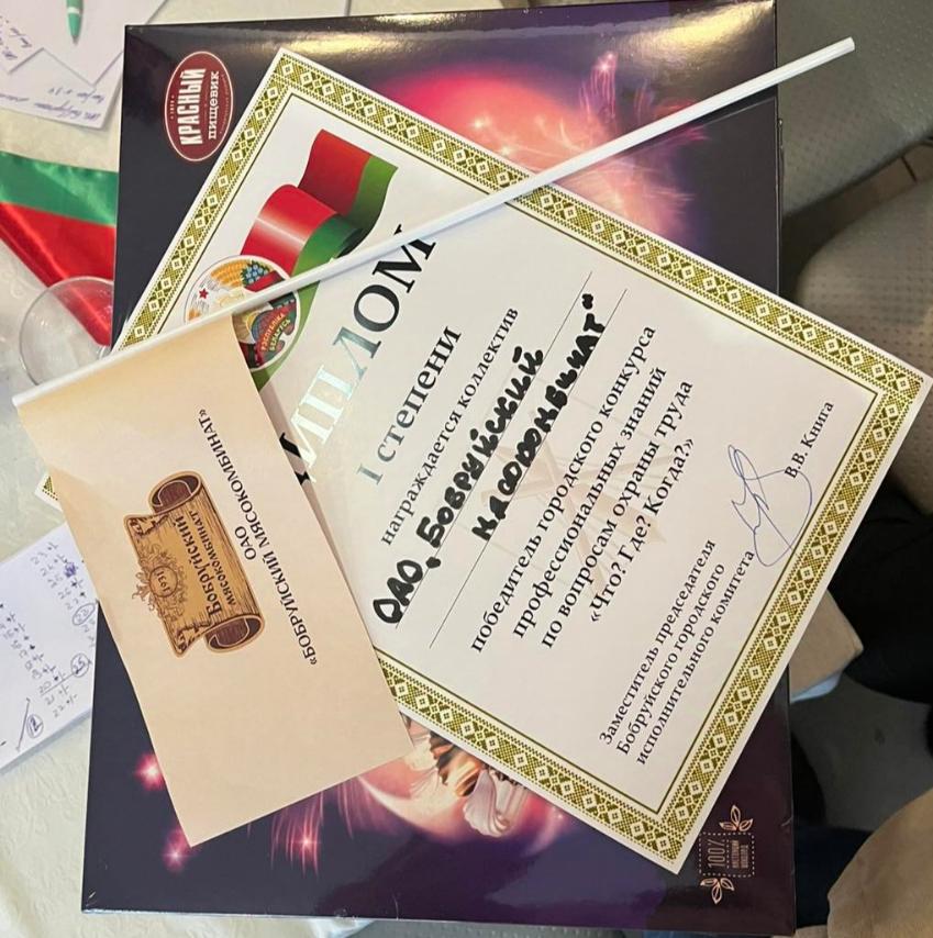 Команда ОАО”БОБРУЙСКИЙ МЯСОКОМБИНАТ” приняла участие в городском конкурсе профессиональных знаний по вопросам охраны труда “Что? Где? Когда?” и заняла 1 место!
