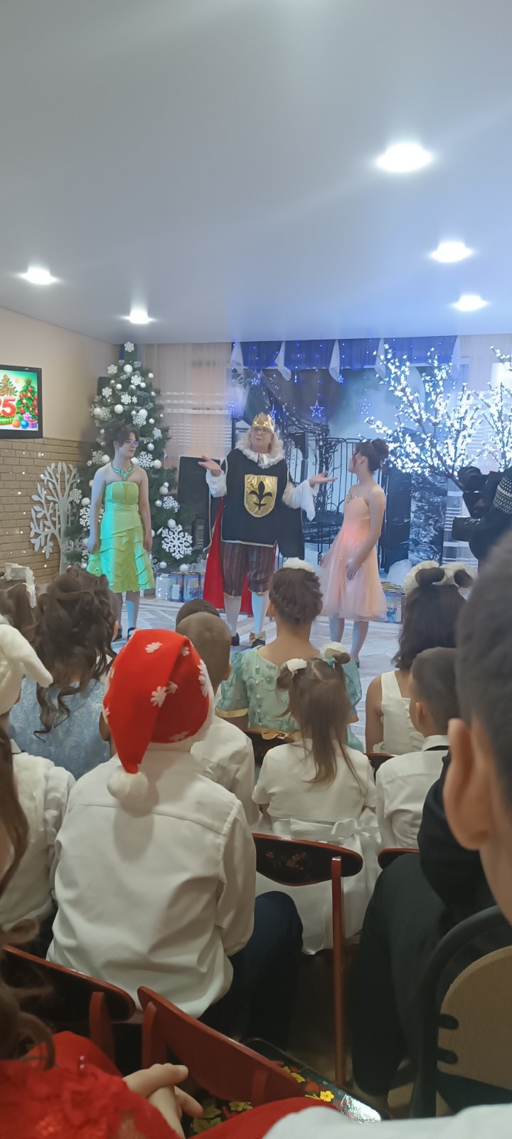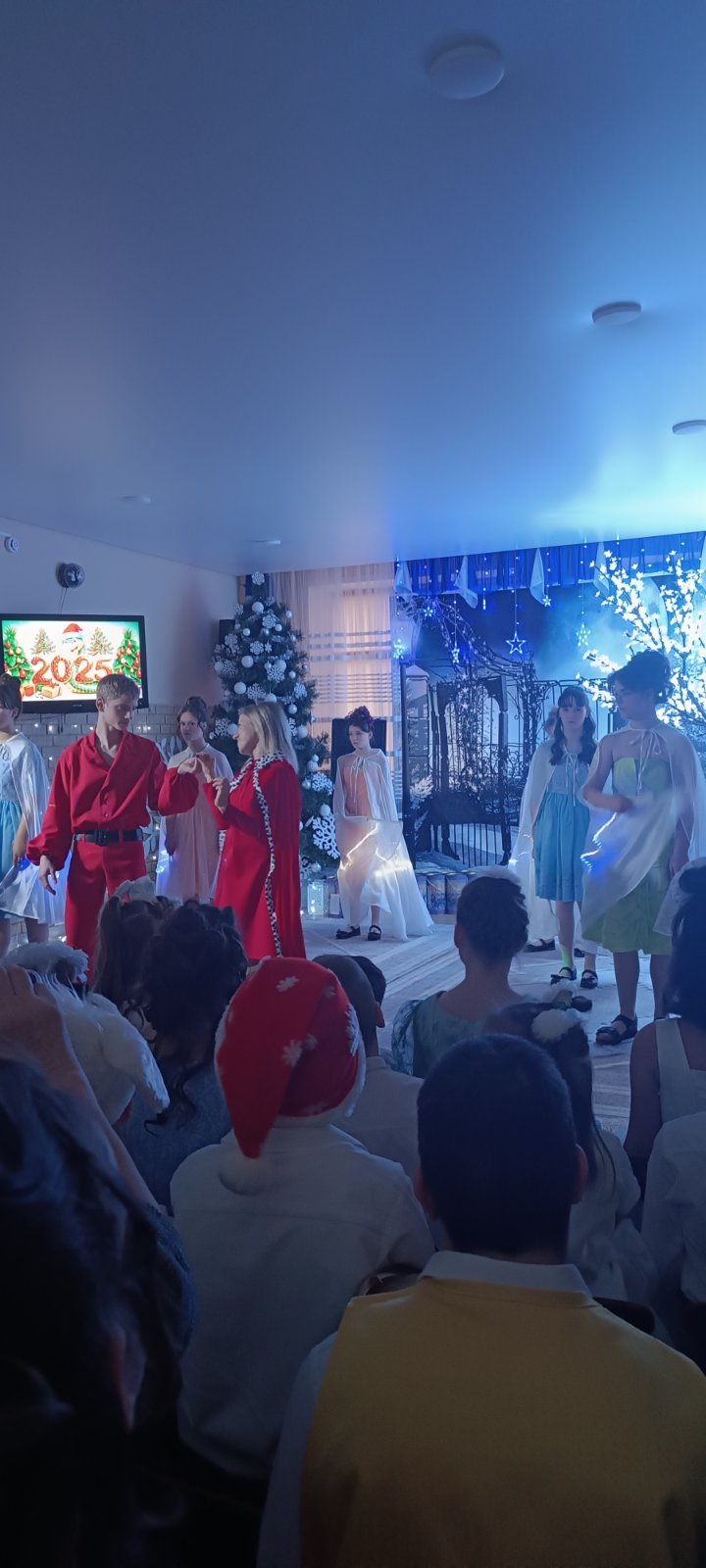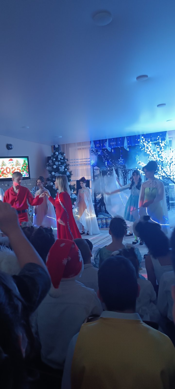 Следующей остановкой в маршруте гостей стал актовый зал. Здесь детям показали сказку «Новогодние фантазии Алисы»…